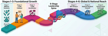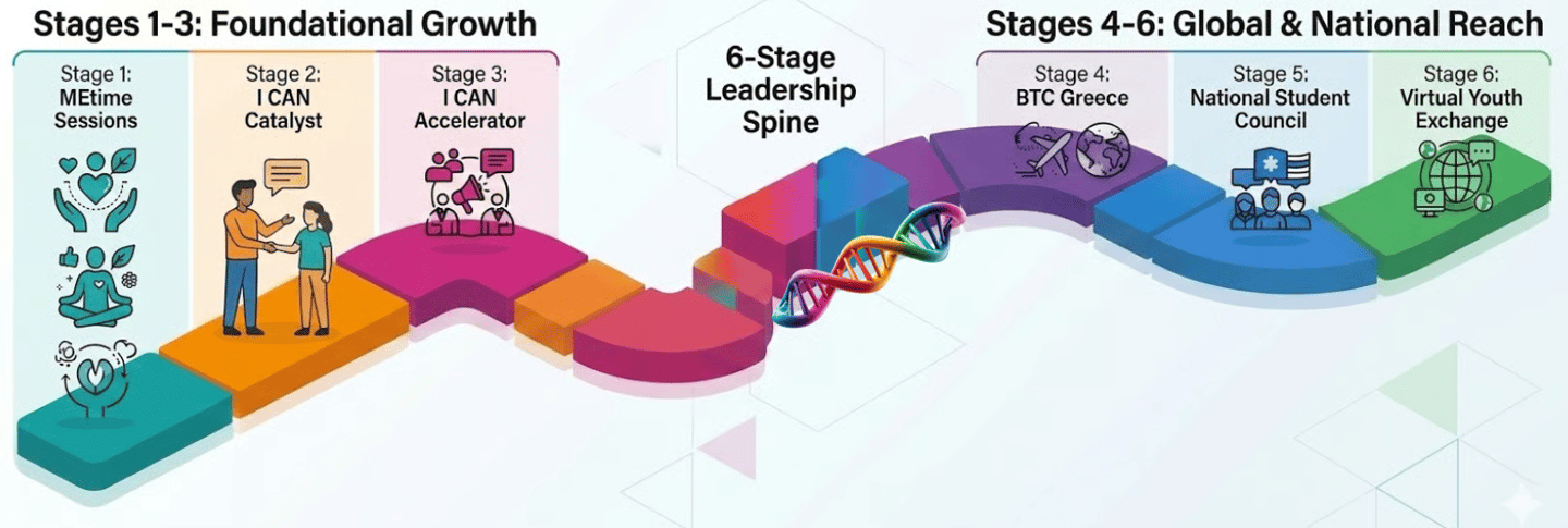 We offer a comprehensive, six-stage developmental pathway that empowers educators and youth to become catalysts for social good. Guided by the global FIDS framework (Feel, Imagine, Do, Share), our curriculum bridges the gap between personal mental health and large-scale civic engagement.
